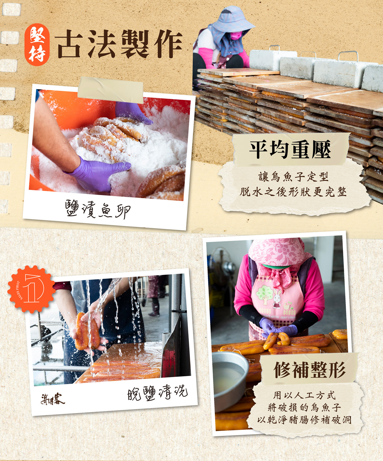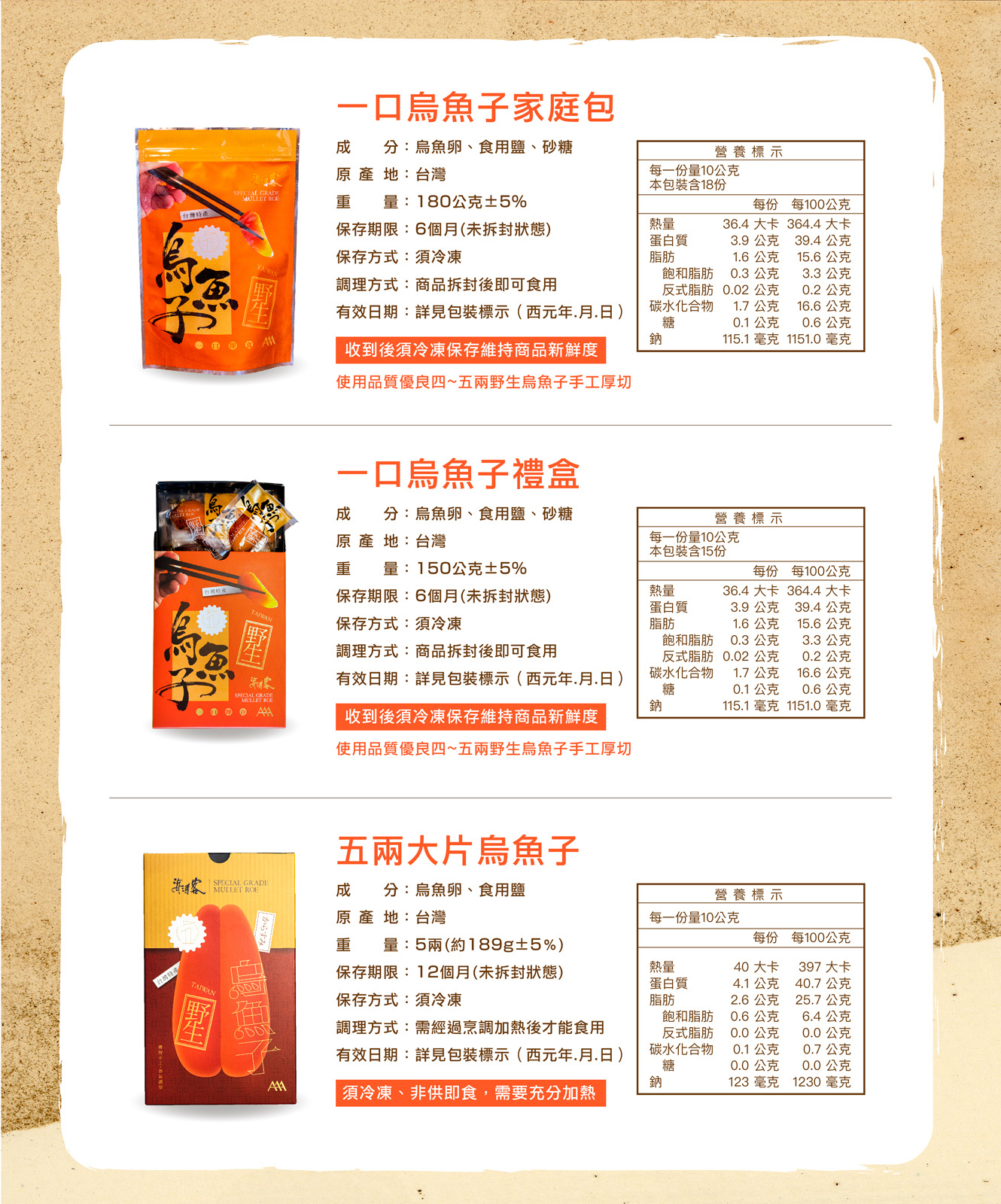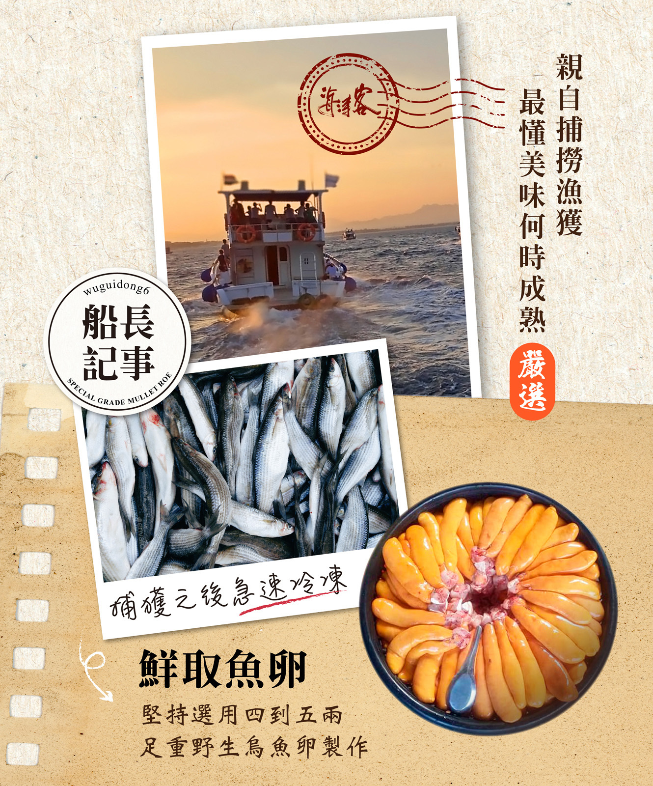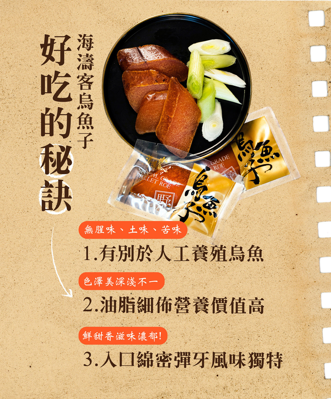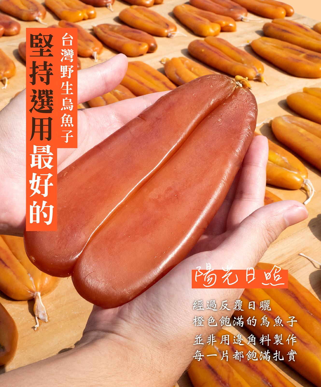 台灣烏魚子產地直送,堅持古法製作,厚實飽滿、色澤亮黃而有透明感,烏魚子品嚐過後齒頰留香無腥味,味道不會過鹹更是逢年過節的送禮首選喔!
