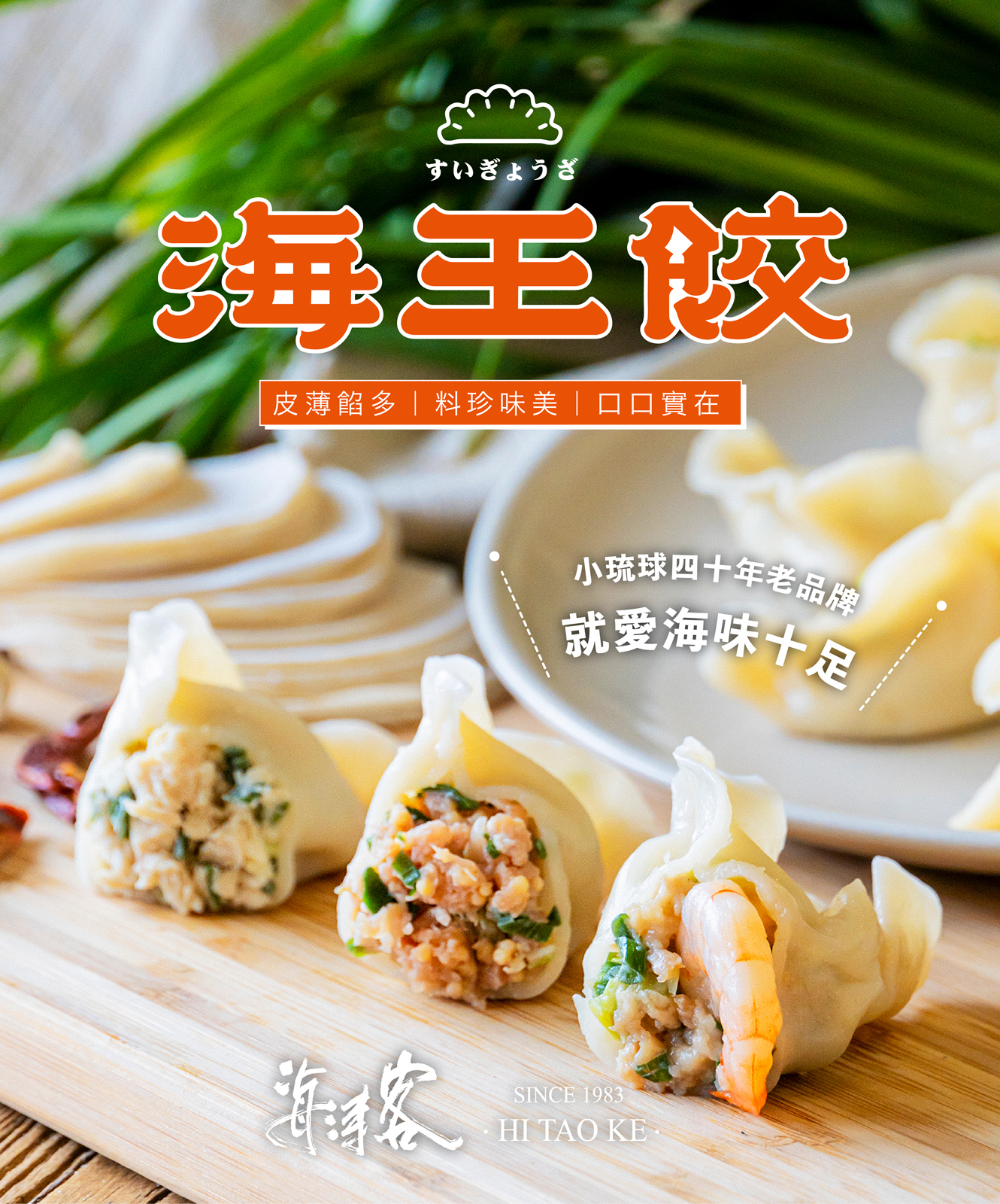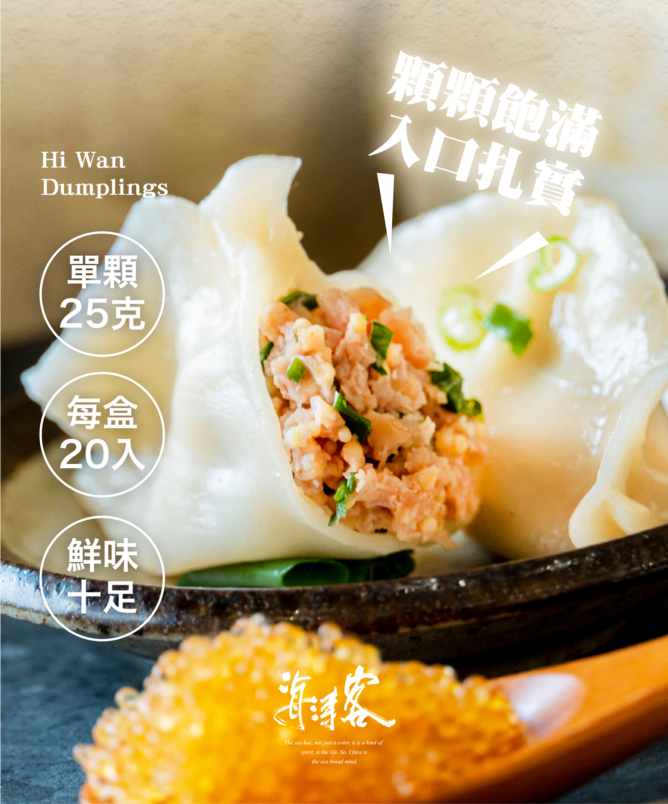 就是要用『風味足、份量足、口感足』的海王餃征服你的味蕾,來自小琉球的特製海味內餡,獨特的口感讓每顆水餃皮薄餡多、香Q帶勁!