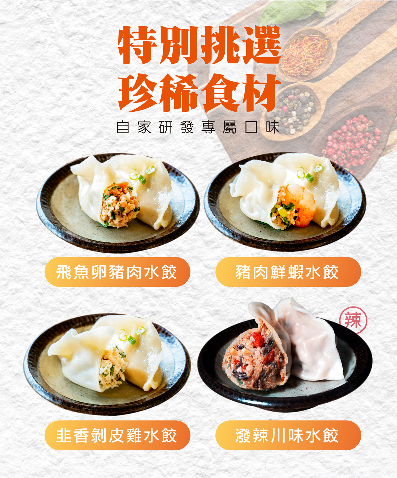 不用再另外沾醬!自帶麻辣醬汁的水餃,辣椒、花椒入餡口感層次更豐富!吃入嘴中爆擊般的滋味瞬間噴發,選用台灣溫體豬後腿肉部分,油脂較少口感佳。