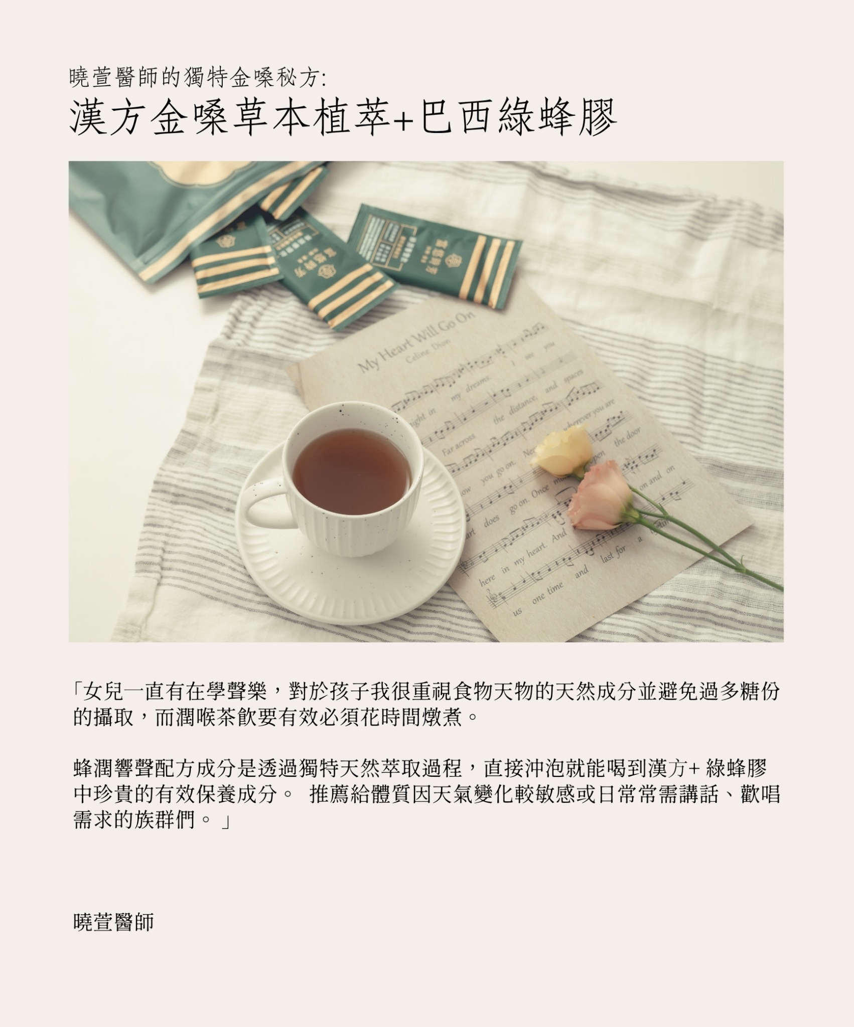 使用頂級巴西綠蜂膠萃取內含獨特成分Artepillin C及中醫師精心調配以胖大海+羅漢果+陳皮+甘草+洋甘菊+百合+薄荷等多種中藥材成分,溫和舒嗓。