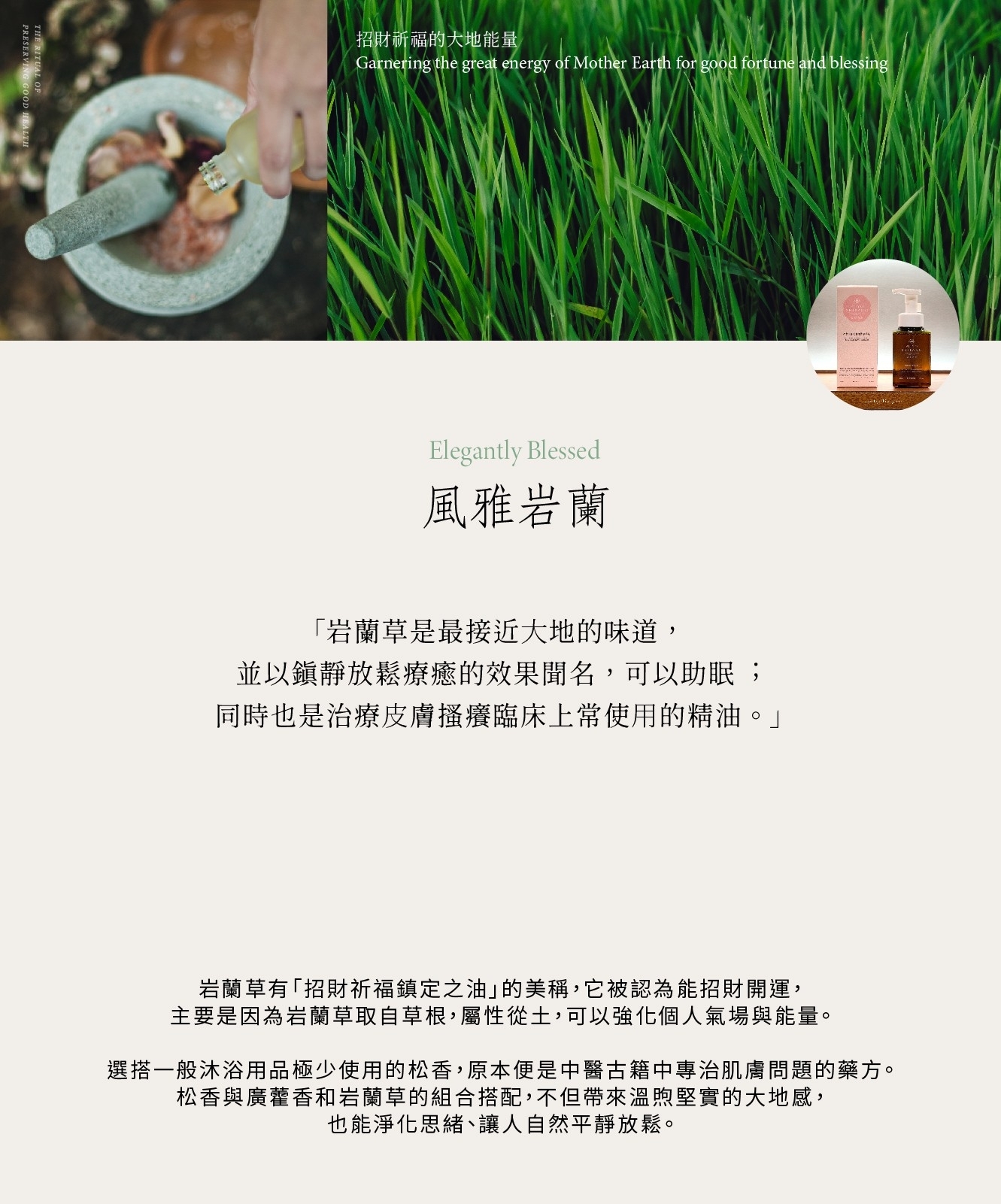 特別選用呵護肌膚的山茶花油,搭配放鬆的植萃精油,給您最自然的洗睦呵護,沈浸在放鬆的沐浴時光