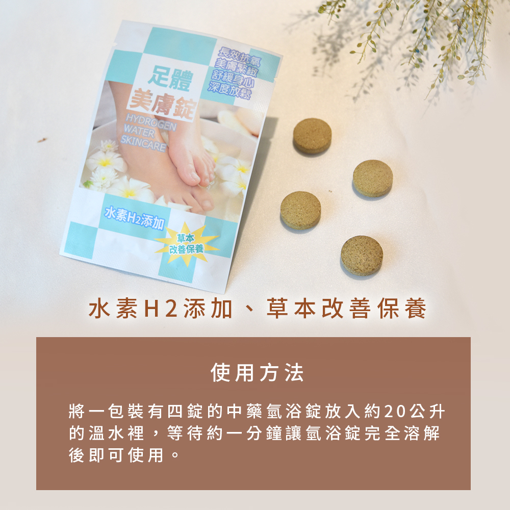 使用方法:將一包裝有四錠的中藥氫浴錠放入約20公升的溫水裡,等待約一分鐘讓氫浴錠完全溶解後即可使用
