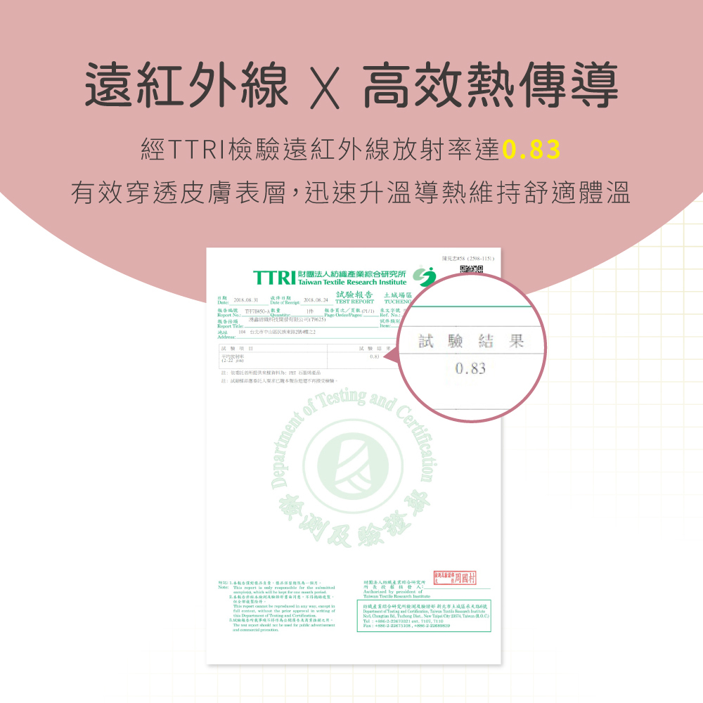 經TTRI檢驗遠紅外線放射率達0.83,有效穿透皮膚表層,迅速升溫導熱維持舒適體溫