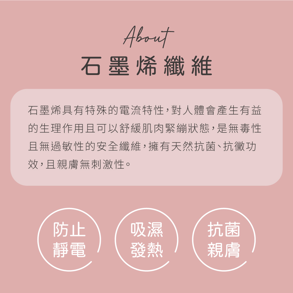 石墨烯具有特殊電流特性,有益人體身體電流,舒緩肌肉緊繃狀態,是無毒性且無過敏性的安全纖維,更擁有天然抗菌、抗黴功效,且親膚無刺激性