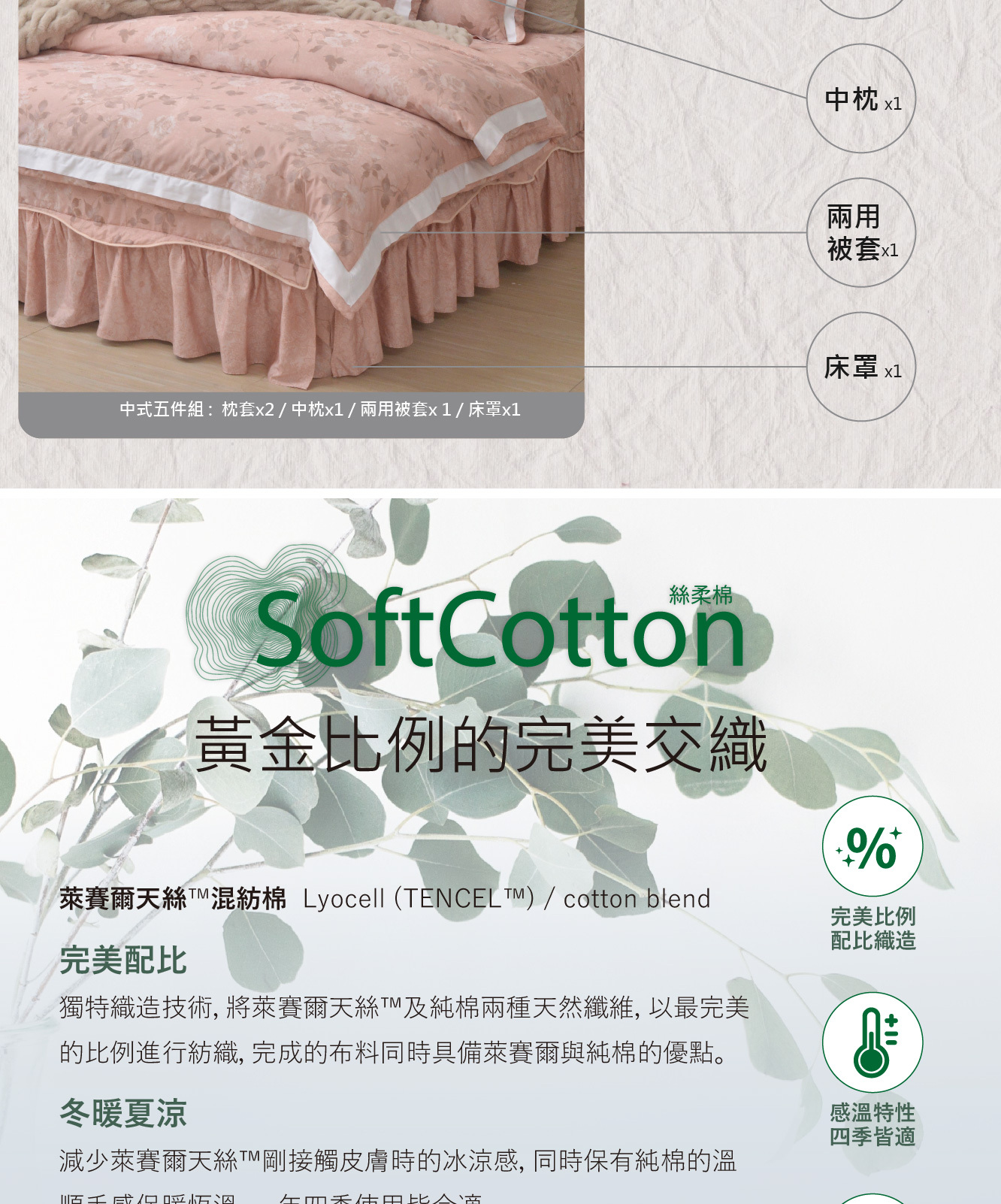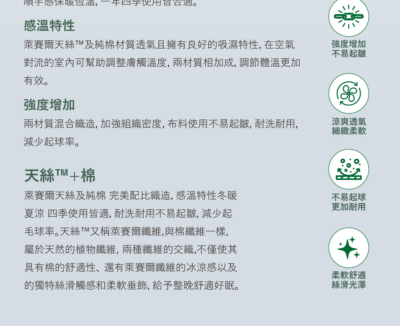 改善MIRCO天絲™易起毛的缺點;質感滑順細緻,柔軟舒適、帶有獨特光澤;吸濕排汗、涼爽透氣,給予整晚舒適好眠。
