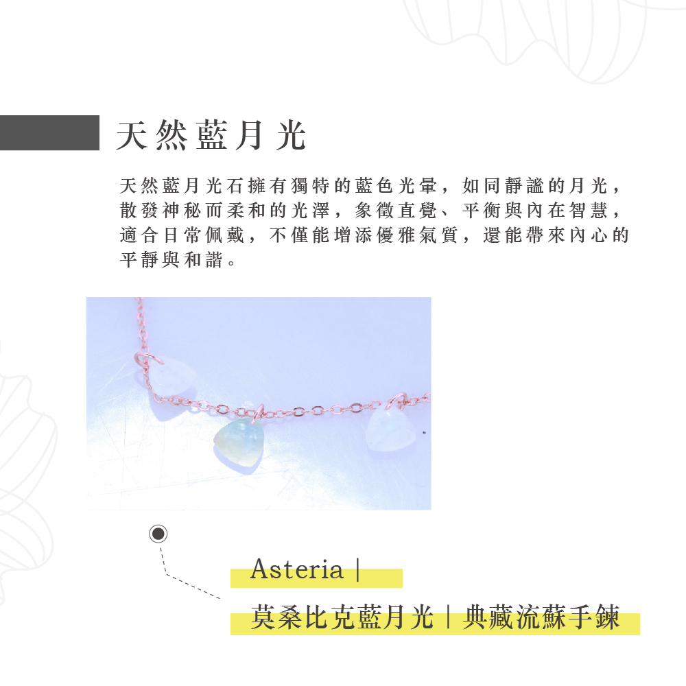 Tỏa ra quầng sáng dịu nhẹ nơi cổ tay, chiếc lắc tay Asteria Mozambique Blue Moonstone Classic Tassel tựa như những vì tinh tú nhẹ nhàng rơi xuống từ bầu trời đêm—thanh mảnh, tinh tế nhưng tràn đầy linh tính.